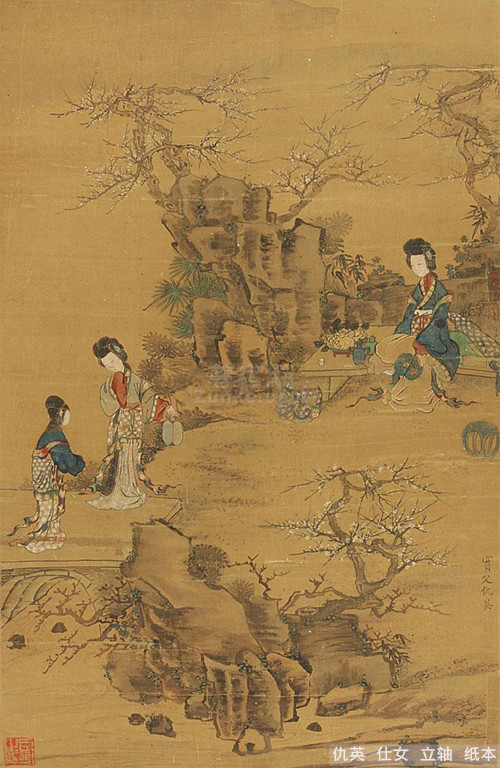 仇英的艺术成熟期大致在嘉靖十年(公元一五三一年)至三十年(公元一五五一年),在这短短的二十余年时间里,他临摹、仿制的名画和自己创作的山水、人物、仕女、界画、鞍马等作品的数量很多,其中如《春夜宴桃李园图》、《清明上河图》、《诸夷职贡图》、《人物故事图》、《金谷图》等等,都是繁华而工致的长轴大卷,其惊人的勤奋和作画态度的严谨专注正如董其昌所叹:“实父作画时,耳不闻鼓以阗骈之声,如隔壁钗钏戒顾。”他是我国古代把毕生精力都献给绘画艺术的伟大画家之一。