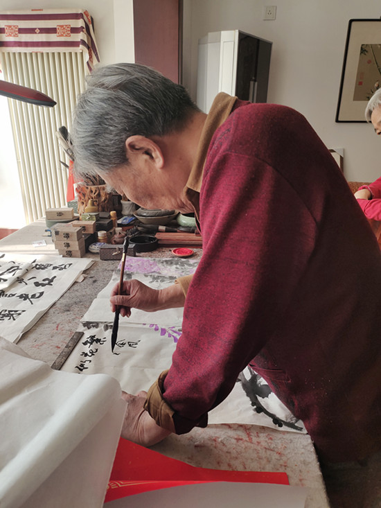 推开那扇熟悉的门,红漆的木格屏风后,是李文启老师伏案挥毫的身影。