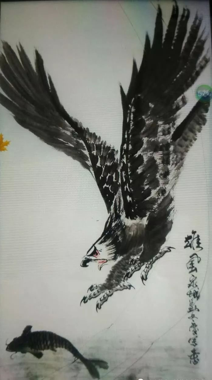 刘文庆先生笔下的鹰,刚强恢宏,传神动人。廖廖不过几笔,就将鹰的磅礴气势跃然纸上。所谓鹰击长空,旨在登高望远,要用高远的眼光,给予进取的动力,才能登上高峰,实现理想。